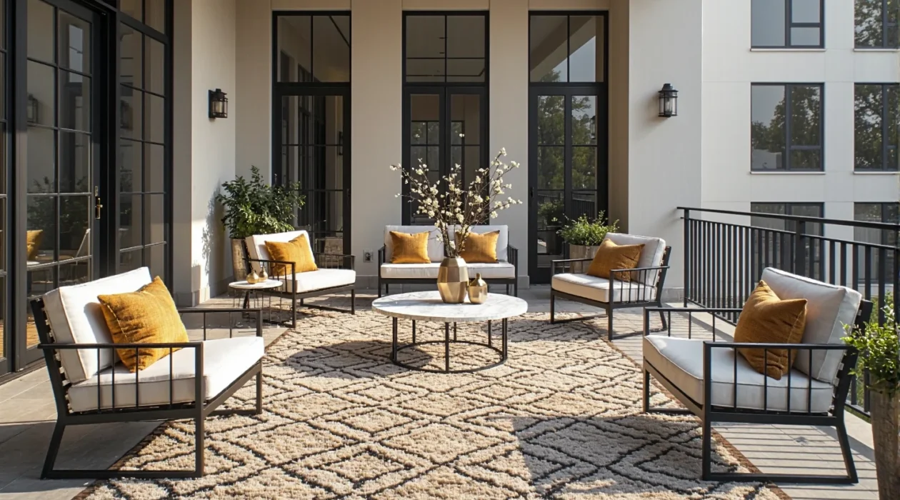 - Szlachetne materiały: Nawet na balkonie warto postarać się o imitacje marmuru, polerowany metal (złoto, mosiądz, chrom) oraz wysokiej jakości tekstylia.
