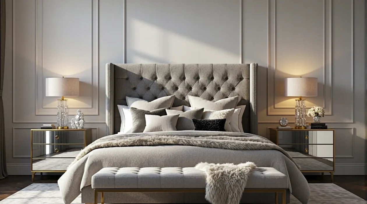 Centralnym punktem każdej luksusowej sypialni jest łóżko. Zapomnij o prostych, drewnianych ramach. W stylu glamour króluje łóżko kontynentalne z wysokim, tapicerowanym zagłówkiem. To właśnie wezgłowie definiuje styl pomieszczenia. Najlepiej sprawdzają się modele z głębokim pikowaniem (typu Chesterfield), wykończone guzikami lub błyszczącymi kryształkami.