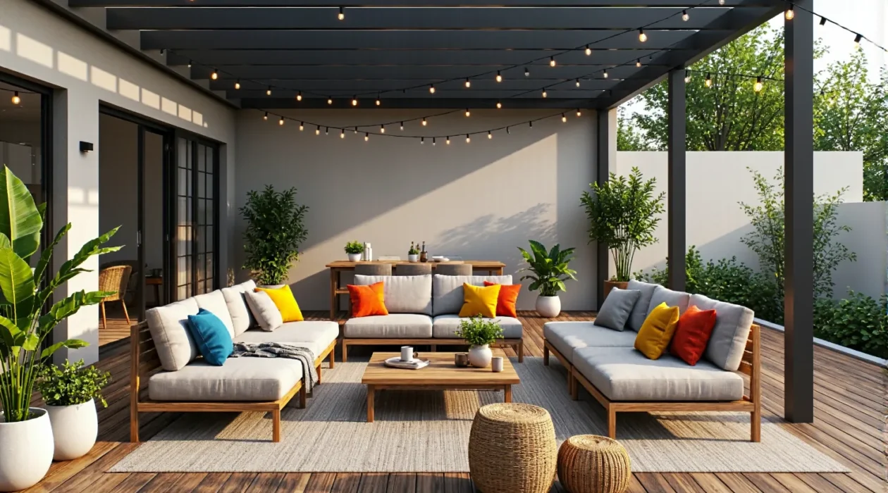 Girlandy LED i nowoczesne kinkiety zewnętrzne tworzące klimat w ogrodowej strefie wypoczynku.